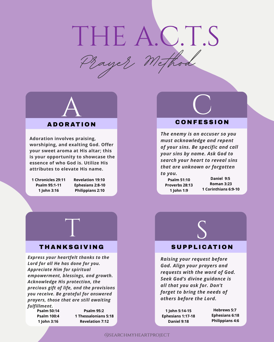 The A.C.T.S. prayer method is a simple and powerful guide to help structure your prayers. The word 'ACTS' serves as an acronym, breaking prayer into four meaningful components: